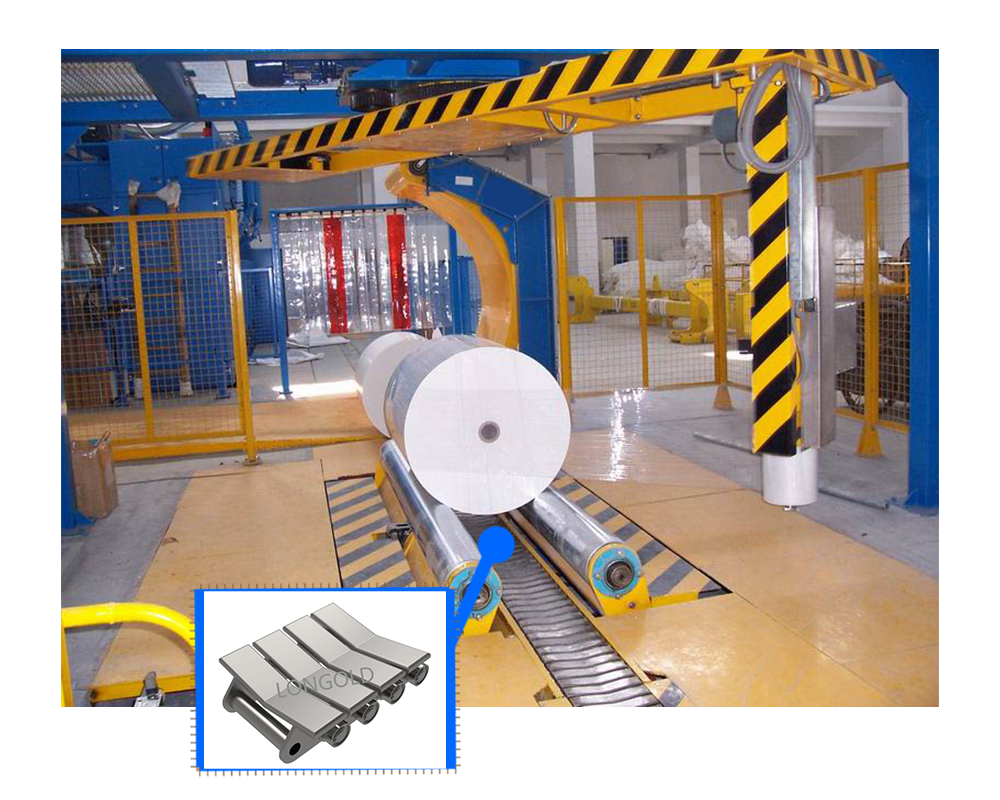 紙卷用輸送鏈帶頂置特殊V型附板,由一系列的鏈節(jié)組成??梢栽谲壍郎蠞L動,從而帶動卷紙向前移動。軌道是卷紙輸送鏈的支撐部件,它可以為滾輪提供支撐和導向。驅(qū)動裝置是卷紙輸送鏈的動力部件,它可以為卷紙輸送鏈提供動力,使其運行。 |