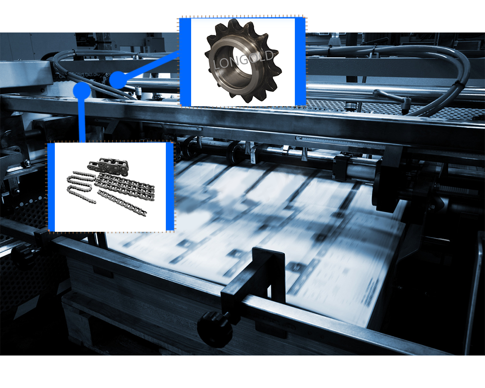 印刷設備通常需要較大的動力來驅(qū)動各個部件的運動,隆德的傳動鏈和鏈輪可以將動力從電機等動力源傳遞到印刷設備的各個部位,確保設備的正常運行。圖中為滾子鏈和鏈輪組合來為印刷設備傳動動力。 |