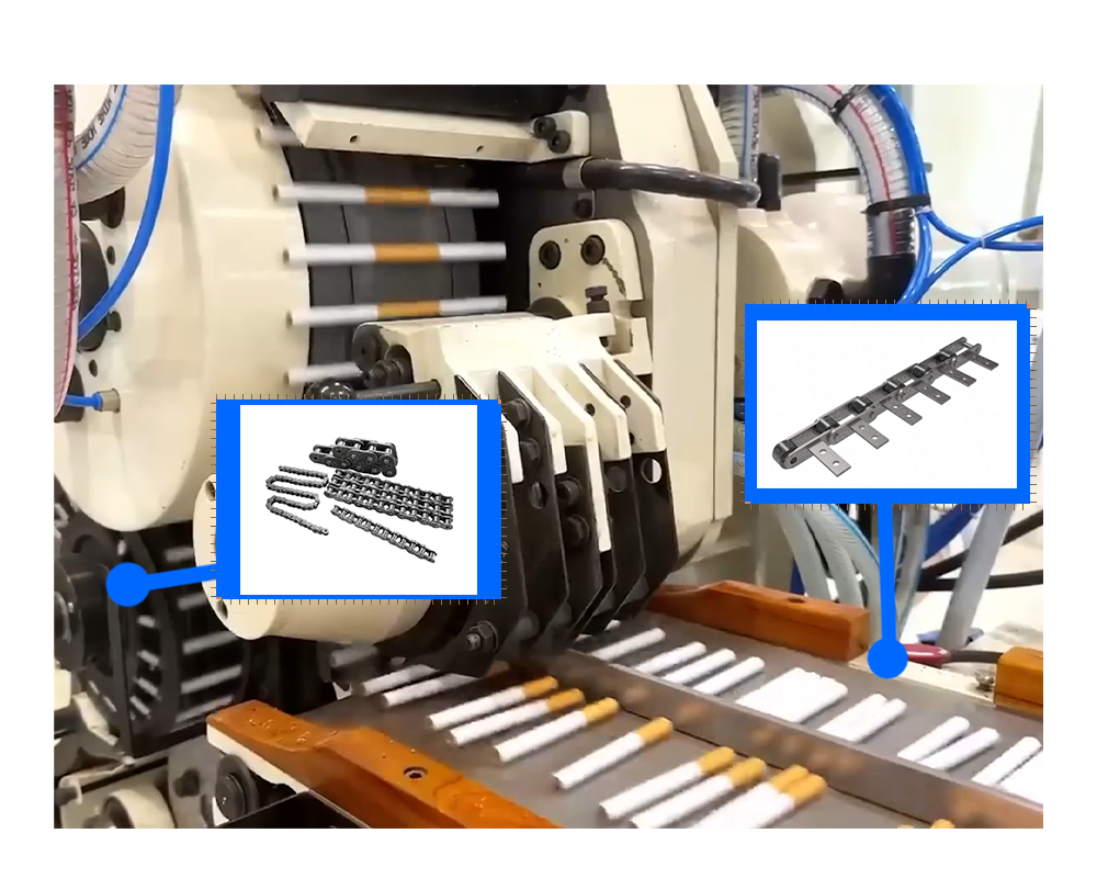 煙草機(jī)械輸送鏈條參與成品與包裝的輸送,傳動鏈驅(qū)動包裝機(jī)械進(jìn)行包裝。 |