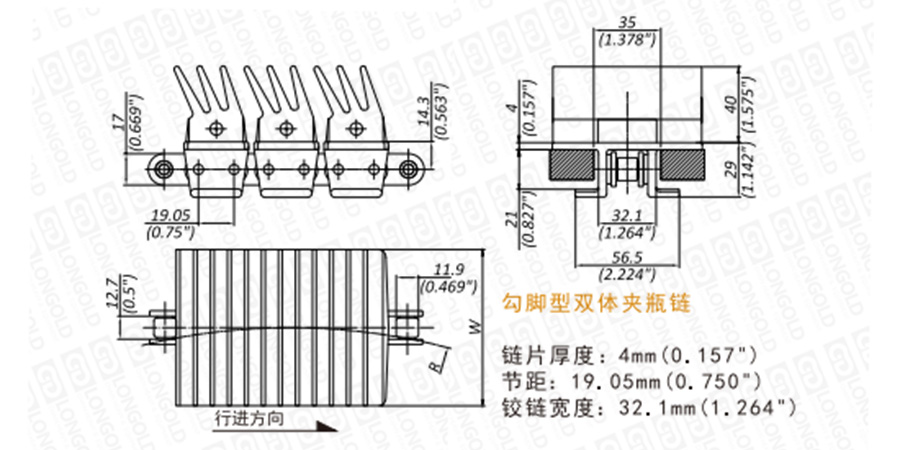 免加油自潤滑鏈條無需定期潤滑,多種規(guī)格的橡膠墊為每一種具體的應(yīng)用施加理想可控的作用力,由滾花的奧氏體不銹鋼銷軸構(gòu)成鏈片和夾爪的可靠系統(tǒng)。EW1843T系列鏈條為勾腳型雙體夾瓶鏈。鏈條節(jié)距更短(12.7毫米),鉸鏈寬度縮小(19.85毫米),鏈片為塑料材質(zhì),鏈片上有橡膠材質(zhì)的長齒,長齒結(jié)構(gòu)在發(fā)生彎曲變化時不會對產(chǎn)品和傳送線增加壓力。特別適合于輸送空玻璃容器類產(chǎn)品。