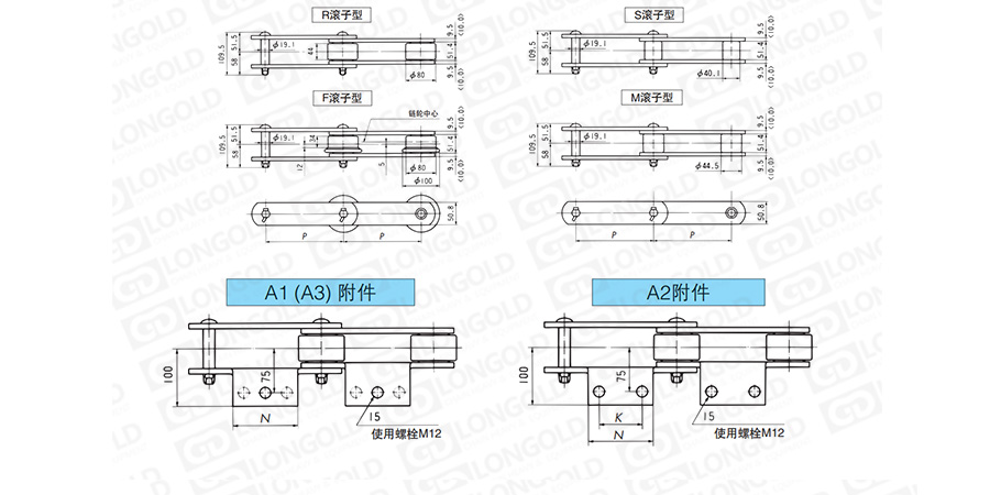 在大型輸送鏈條17200·17250·17300的單側(cè)帶折彎板附件。附件是為了將夾具安裝在鏈條上的零部件,可根據(jù)客戶要求設(shè)定安裝間隔。附件上帶有1個或者2個或者3個孔,附件表示為:A1、A2、A3。