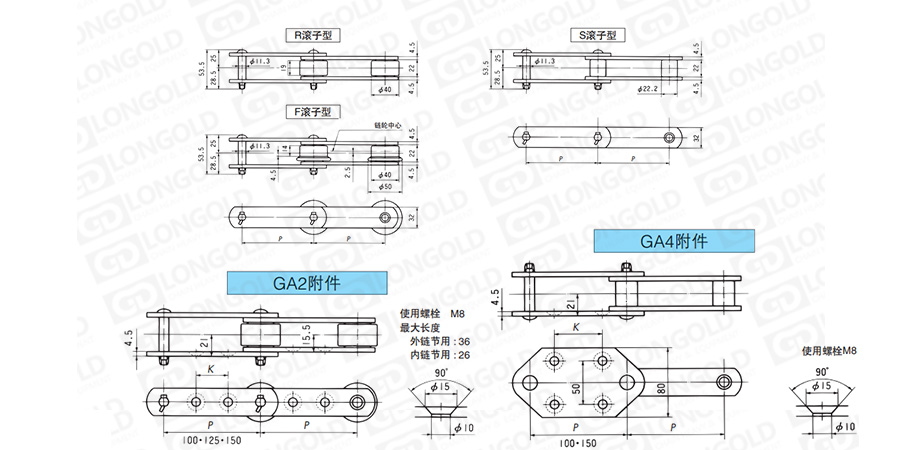 上圖為帶GA附件LDC05100~LDC05150規(guī)格輸送鏈的結構圖以及帶附件結構圖。