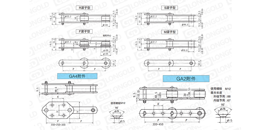 在26200·26450米制節(jié)距大型輸送鏈條的單側(cè)作特殊形狀和開孔的鏈條。附件是為了將夾具安裝在鏈條上的零部件,可根據(jù)客戶要求設(shè)定安裝間隔。附件表示為:GA2、GA4。