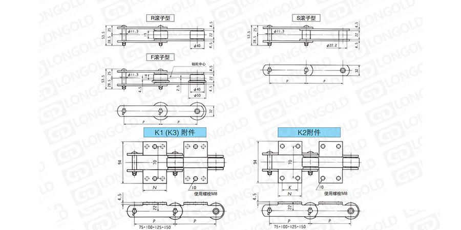 在05075·05100·05125·05100米制節(jié)距大型輸送鏈條的兩側(cè)加裝折彎板附件的鏈條。附件是為了將夾具安裝在鏈條上的零部件,可根據(jù)客戶要求設(shè)定安裝間隔。附件上帶有1個(gè)或者2個(gè)或者3個(gè)孔,附件表示為:K1、K2、K3。