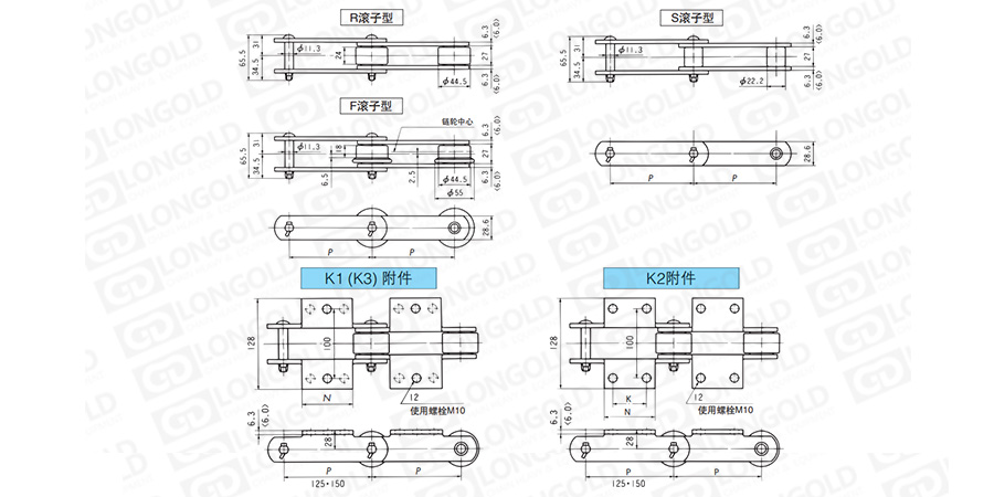 上圖為帶K附件LDC08125~LDC08150規(guī)格輸送鏈的結構圖以及帶附件結構圖。