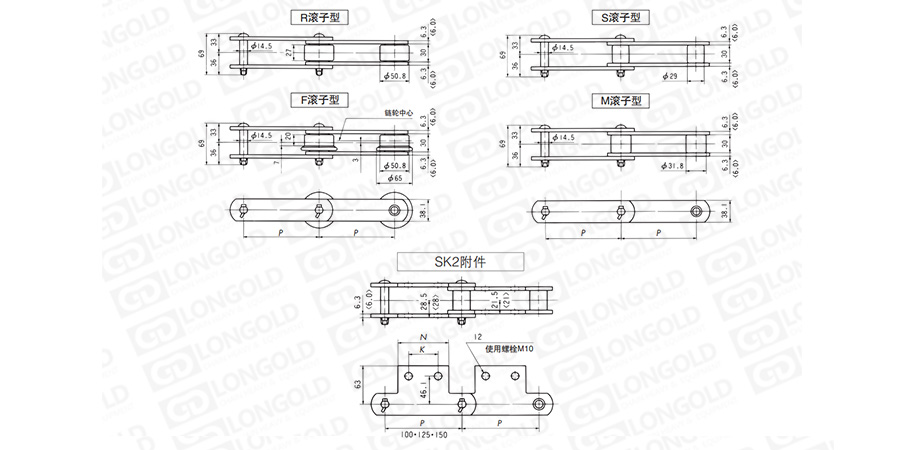 上圖為帶SK2附件LDC10100~LDC10150規(guī)格輸送鏈的結(jié)構(gòu)圖以及帶附件結(jié)構(gòu)圖。