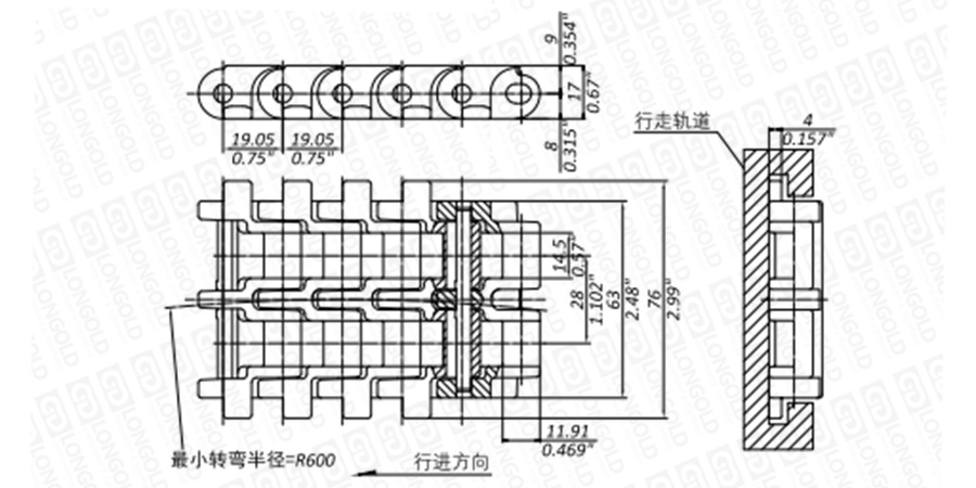 上圖為LSP-CU-2系列轉(zhuǎn)彎鏈的結(jié)構(gòu)圖,圖紙已標(biāo)明本體尺寸。