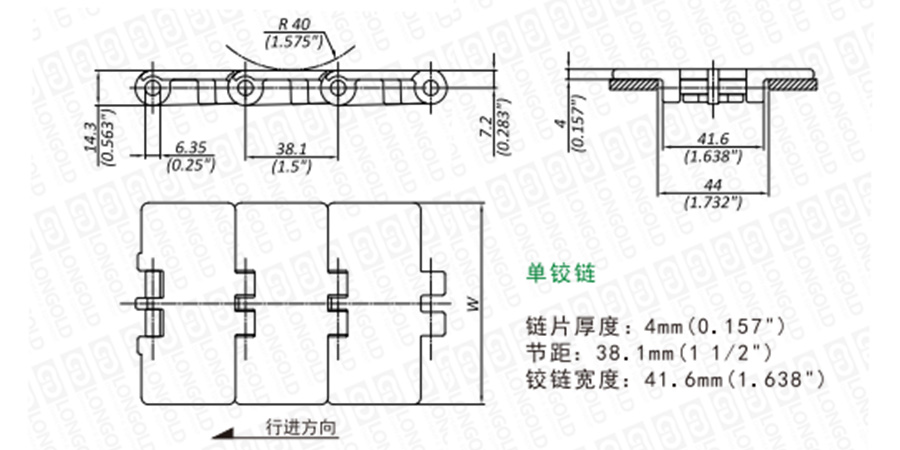上圖為LD820系列直行鏈的結(jié)構(gòu)圖,圖紙已標(biāo)明本體尺寸。