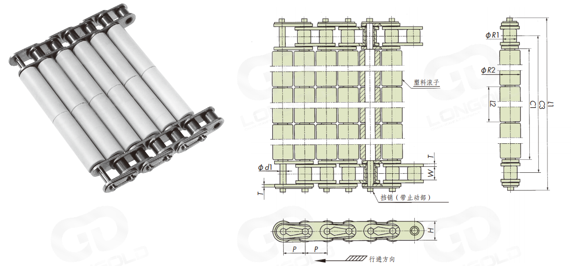 塑料滾子安裝在鏈條的節(jié)線上,即使在彎曲時(shí)塑料滾子的間隔也保持不變。