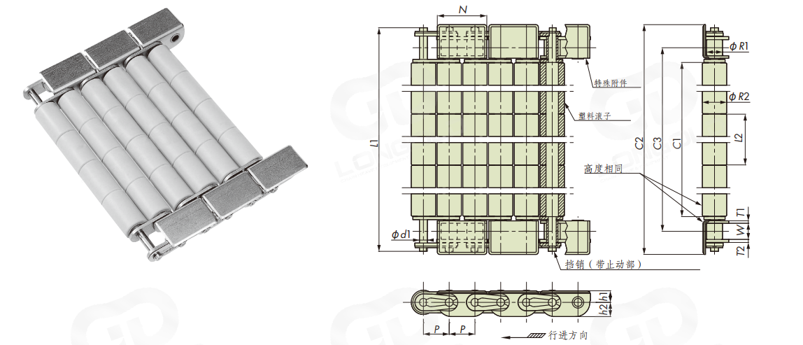 塑料滾子安裝在鏈條的節(jié)線上,即使在彎曲時塑料滾子的間隔也保持不變。