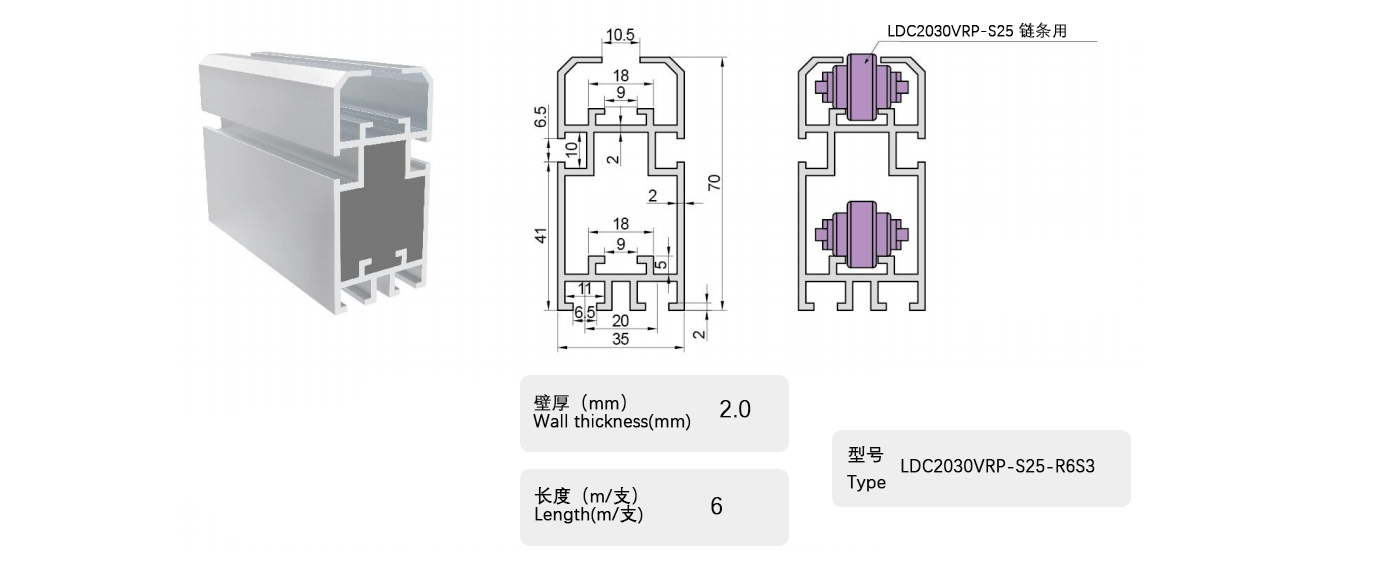 倍速鏈條用鋁制框架,用于滾子部采用工程塑料的倍速鏈條,包括帶蓋罩的倍速鏈條。在鋁制框架的輸送側(cè)小直徑滾子部安裝有鋼軌,可用于所有倍速鏈條。