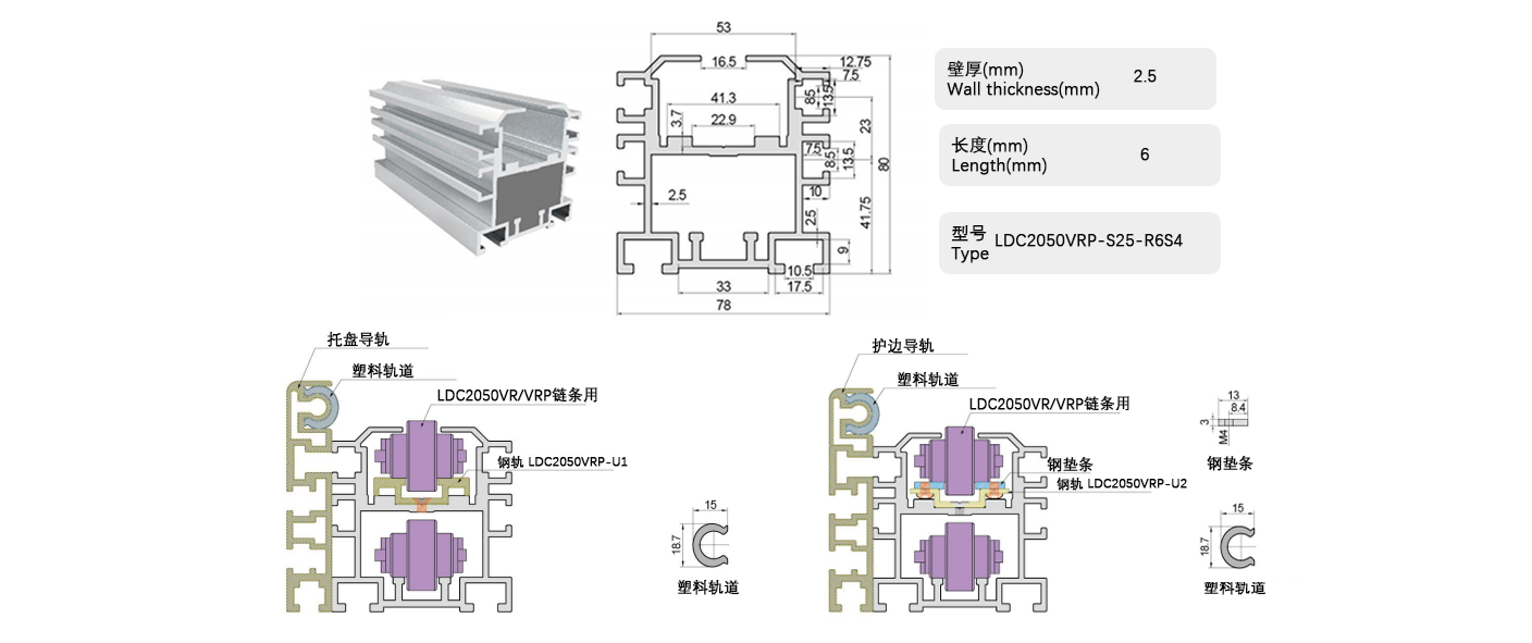 倍速鏈條用鋁制框架,用于滾子部采用工程塑料的倍速鏈條,包括帶蓋罩的倍速鏈條。在鋁制框架的輸送側(cè)小直徑滾子部安裝有鋼軌,可用于所有倍速鏈條。