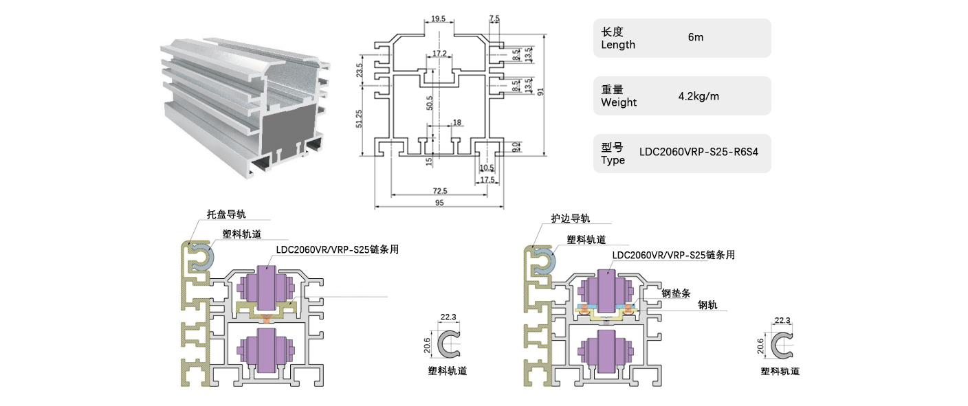 在鋁制框架的輸送側小直徑滾子部安裝有鋼軌,可用于所有倍速鏈條。
