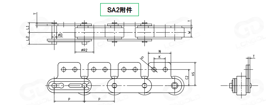 使用超級工程塑料制滾子,本體為不銹鋼鋼制的雙倍節(jié)距鏈條。在套筒和滾子之間可無加油使用。實(shí)現(xiàn)了輕量化和低噪音化。鏈條單側(cè)鏈板向上延伸作為附件,附板上帶有一個(gè)或者兩個(gè)螺孔,附件表示為:SA1和SA2。