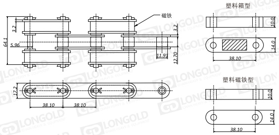 上圖為帶磁性雙倍節(jié)距鏈條帶磁鐵附件結(jié)構(gòu)圖。