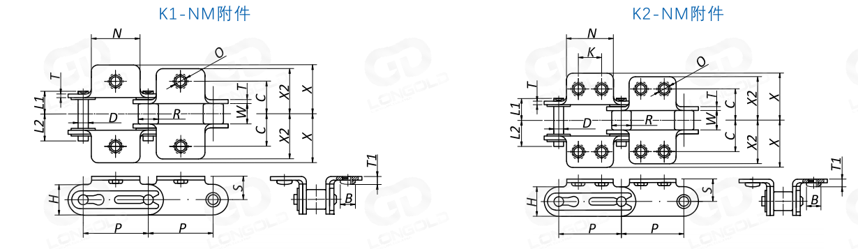 鏈條兩側(cè)帶有折彎板附件,附板上有1個(gè)或者2個(gè)螺孔,且附件上裝有螺母,附件表示為K1-NM,K2-NM。