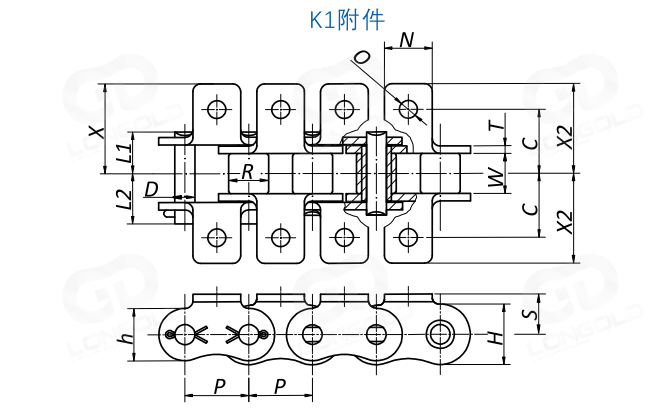 鏈條兩側(cè)帶折彎板附件,附件上有1個孔,孔徑大小為特制的。