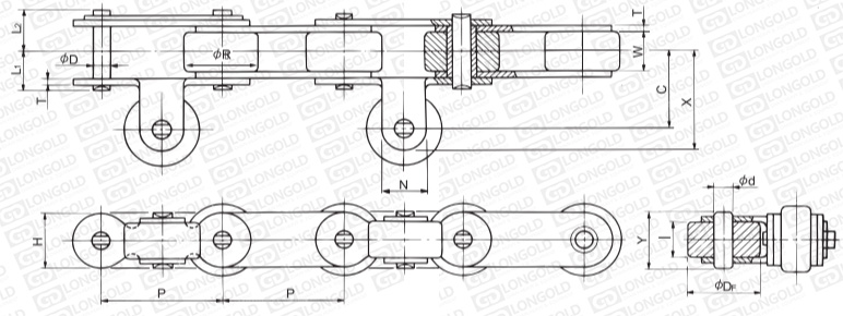 帶導向滑輪雙倍節(jié)距輸送鏈將導向滑輪作為蛇形防止與常規(guī)滾子使用。與帶附件A系列滾子鏈相比,鏈條節(jié)距成倍數(shù)(稱為雙倍節(jié)距),鏈板形狀為直板形。附件表示為:GR。