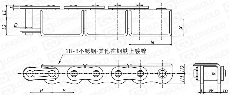 上圖為帶內彎附件雙倍節(jié)距鏈S滾子帶附件圖。