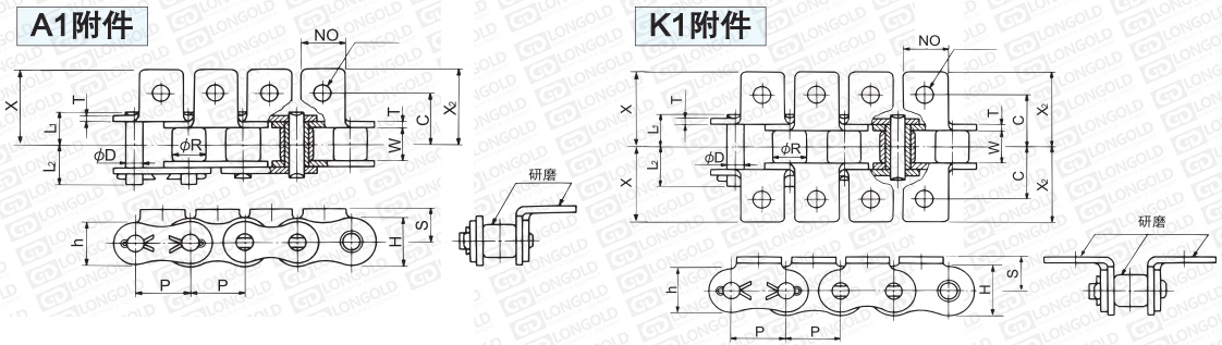 A系列小型輸送鏈的滾子為研磨規(guī)格。帶附件鏈條對附件的外表面進行研磨。附件表示為:PG。
