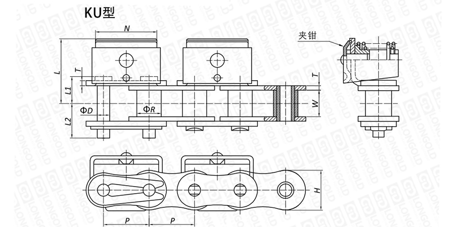 鏈條加裝KU型夾鉗,用于抓握,拉動和運輸壁薄但表面積較大的材料。