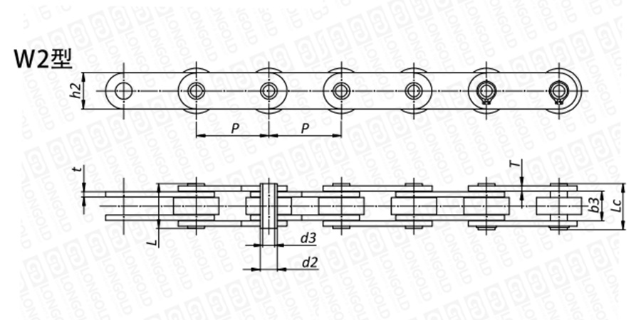 附件負(fù)荷均等加以兩側(cè)鏈板。在強(qiáng)度方面具有優(yōu)勢,鏈條運行時不易引起蛇行。