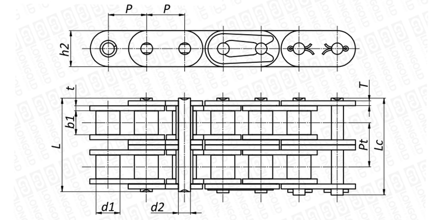 上圖為雙排不銹鋼短節(jié)距B系列直板滾子鏈本體的結(jié)構(gòu)圖。