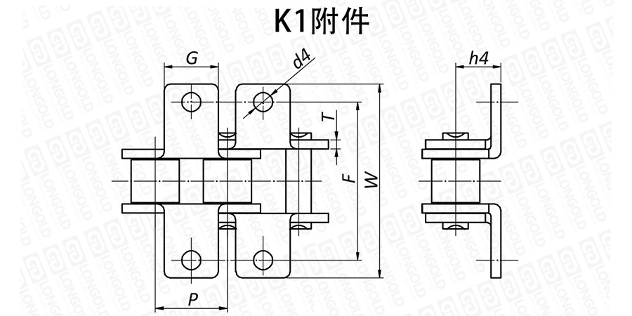 鏈條兩側(cè)帶折彎板附件,附板上帶1個(gè)螺孔,附件表示為:K1。