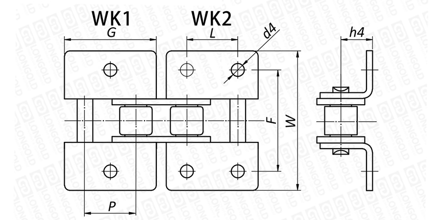 上圖為不銹鋼滾子鏈帶WK1和WK2附件的結(jié)構(gòu)圖。