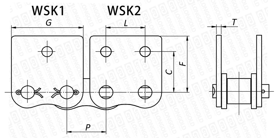 鏈條兩側(cè)帶有一定寬度的直立翼板附件,附板上有1個或者2個螺孔,附件表示為:WSK1和WSK2。