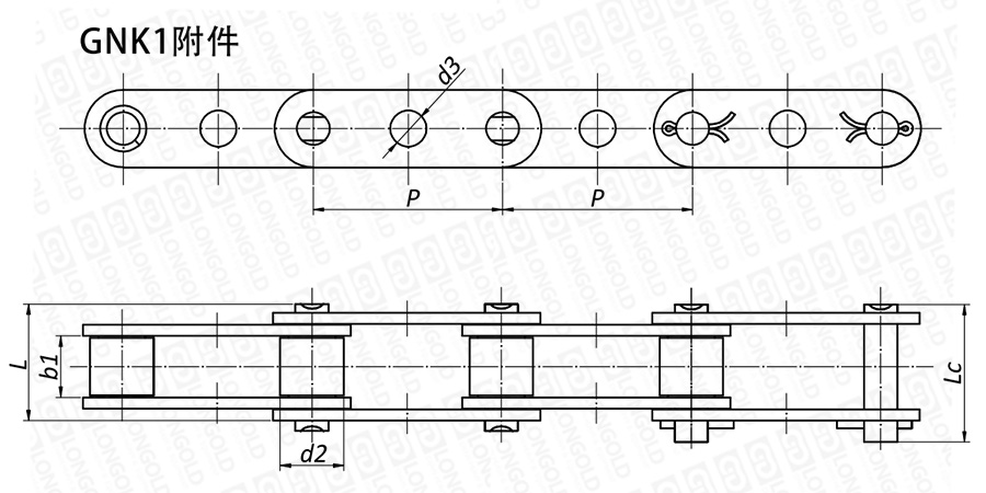 上圖為不銹鋼雙倍節(jié)距鏈帶GNK1附件的結(jié)構(gòu)圖。