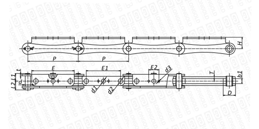 附件可配裝在每一個(gè)鏈節(jié)以上的鏈節(jié)間隔,如每偶數(shù)鏈節(jié)安裝,為了容易進(jìn)行保養(yǎng),安裝在外鏈節(jié)。