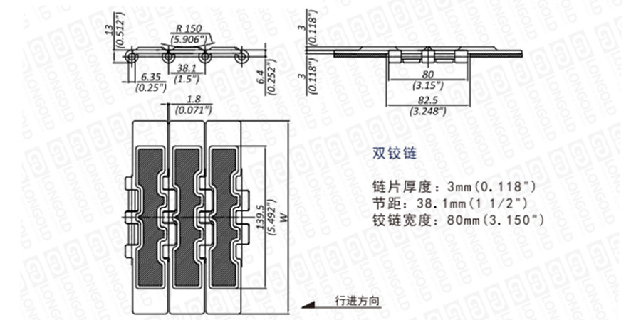 雙鉸鏈條,鉸鏈寬度為80毫米,卓越的表面光潔度與平整度,優(yōu)質(zhì)的合金鋼材質(zhì)增強(qiáng)了耐磨性與滑動(dòng)性能。