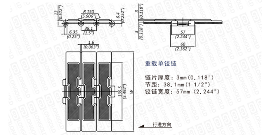 上圖為LDPHDG9157系列直行鏈的結構圖,圖紙已標明本體尺寸。