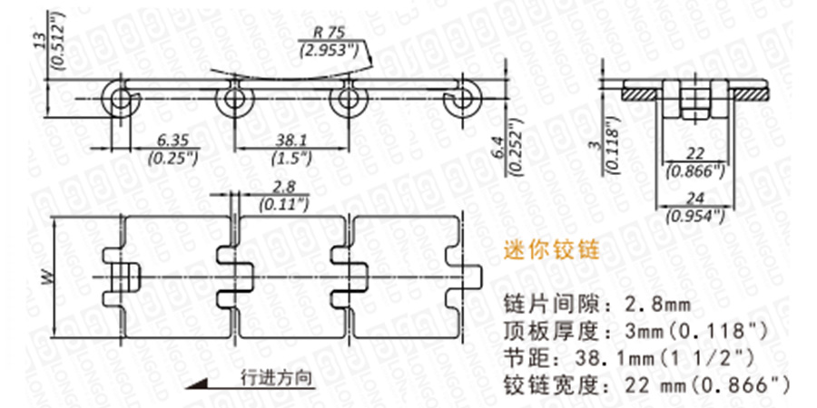 803系列直行鏈,鏈片間距為1.8毫米,鏈板細長,當鏈片材質為碳鋼時,銷軸材質為表面硬化鋼;當鏈片材質為不銹鋼時,銷軸材質也選用不銹鋼。