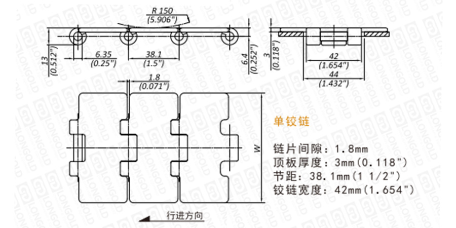 頂板鏈的鏈板通常比較寬大且厚實,其形狀多為平板狀。鏈片間距為1.8毫米。當鏈片材質為碳鋼時,銷軸材質為表面硬化鋼;當鏈片材質為不銹鋼時,銷軸材質也選用不銹鋼。