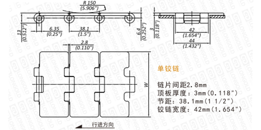 采用圓弧倒角,頂板上表面邊緣圓滑。傳送順暢、平滑,橫向和縱向間隙減小,更有利于產(chǎn)品運(yùn)作。