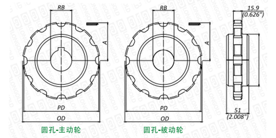 上圖為880系列鏈輪-機加工分體式主動輪以及被動輪的結(jié)構(gòu)圖。