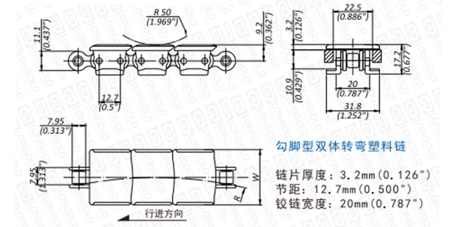 雙體鏈便于更換塑料節(jié),高機(jī)械強(qiáng)度,同單體鏈相比,即便是在負(fù)載條件下頻繁啟動(dòng)同樣可以長(zhǎng)距離傳送并減小拉伸。1843T系列為勾腳型雙體轉(zhuǎn)彎塑料鏈條,鏈條節(jié)距為12.7毫米。