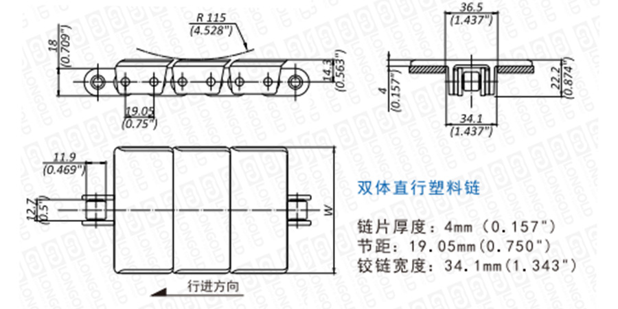 雙體鏈便于更換塑料節(jié),高機(jī)械強(qiáng)度,同單體鏈相比,即便是在負(fù)載條件下頻繁啟動(dòng)同樣可以長(zhǎng)距離傳送并減小拉伸。863系列直行鏈,基鏈為鋼制鏈條,上附塑料頂板,鏈條節(jié)距為19.05毫米。