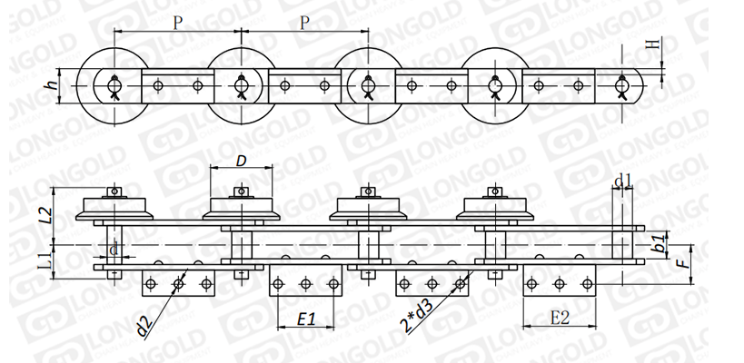 鏈條單側(cè)帶F型滾子,另一側(cè)帶A3附件,即一側(cè)帶折彎板,折彎板上帶三個孔。