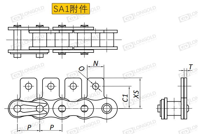 SA1附件,鏈條單側(cè)鏈板延伸作為附板,且附板上帶單孔的附件形式。