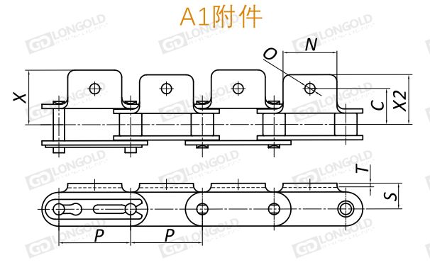 A1附件,鏈條單側(cè)帶折彎板,且附板上帶單孔的附件。