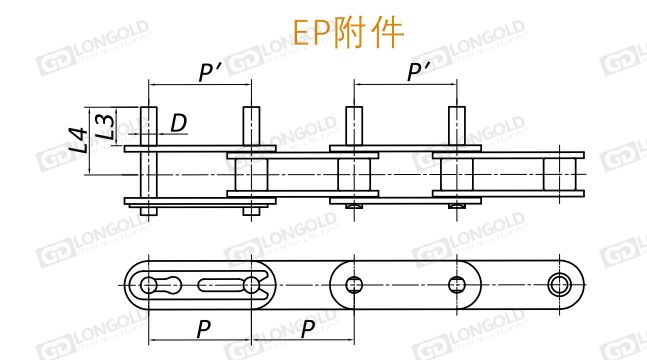 EP附件,鏈條的一側(cè)銷軸延伸的形式,這種形式的附件,可以在延長(zhǎng)的銷軸部分根據(jù)客戶的需求做非標(biāo)加工。