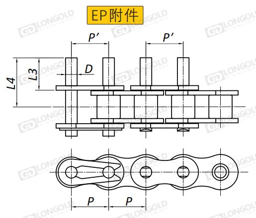 EP附件,鏈條單側(cè)銷軸延長(zhǎng),延長(zhǎng)銷部分可以根據(jù)客戶需求定制。
