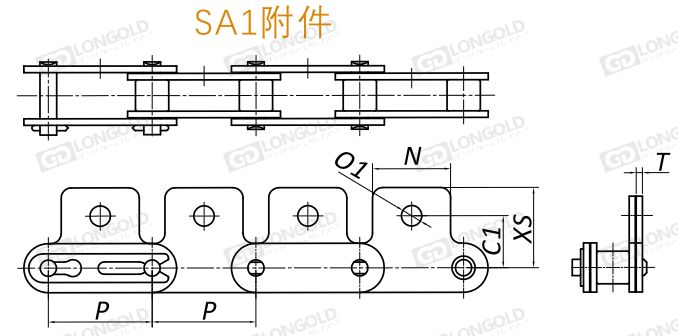 SA1附件,鏈條的一側(cè)鏈板延伸,且附板上帶一個孔的附件形式。對內(nèi)、外鏈板都實施了熱處理,略帶耐腐蝕性,同時加強了鏈條整體美觀,給人以高級的感覺。