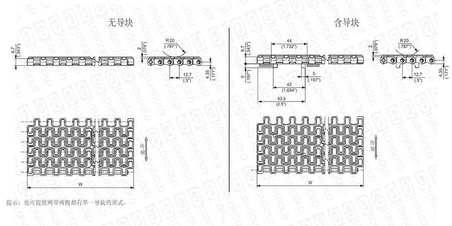上圖為1/2"節(jié)距網帶與鏈板 HF510系列的結構圖,圖紙中已標明部分尺寸。