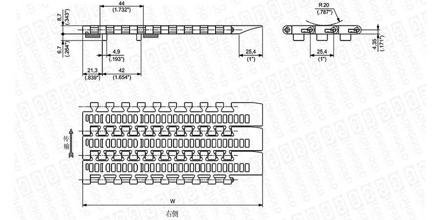 上圖為1"節(jié)距輕載鏈板 1500G ATM系列的結(jié)構(gòu)圖,圖紙中已標(biāo)明部分尺寸。