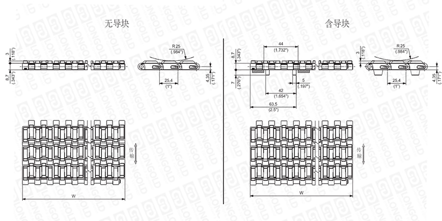 上圖為1"節(jié)距輕載網(wǎng)帶與鏈板 HF1600系列的結(jié)構(gòu)圖,圖紙中已標(biāo)明部分尺寸。