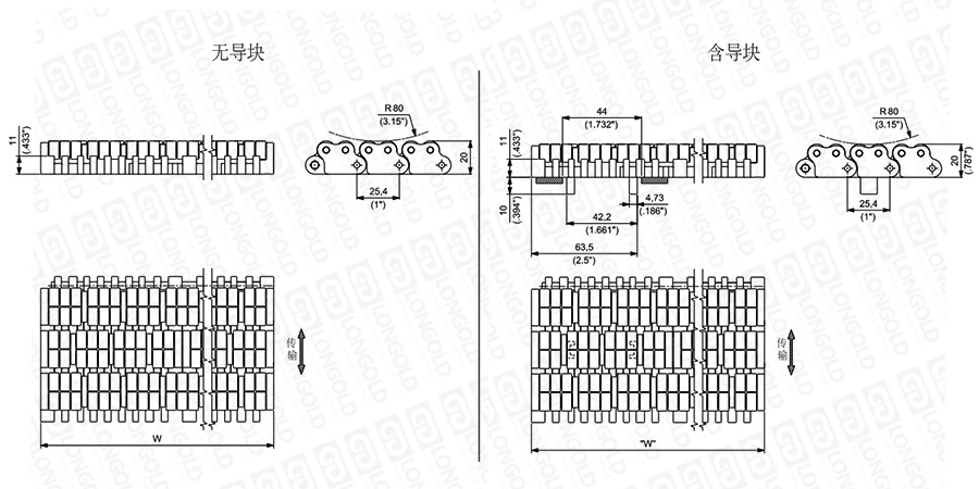 上圖為1"節(jié)距重載網(wǎng)帶與鏈板 LBP XSPM系列系列,圖紙中已標明部分尺寸。